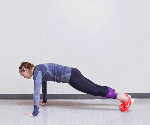 Start in a plank position, with your wrists under your shoulders and your feet hip-width apart. If you cannot do a plan on your toes, you can come down to your knees, but make sure your knees are behind your hips to ensure you still retain tension in your core.